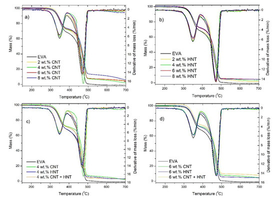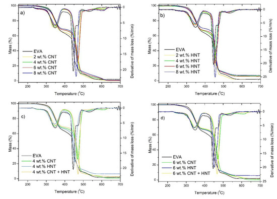 TG and DTG curves of: EVA/MWCNT nanocomposites (a); EVA/HNT nanocomposites (b); EVA-based nanocomposites at the total nanofillers content of 4 wt.% (c); and EVA-based nanocomposites at the total nanofillers content of 6 wt.% (d) measured in an oxidizing atmosphere.