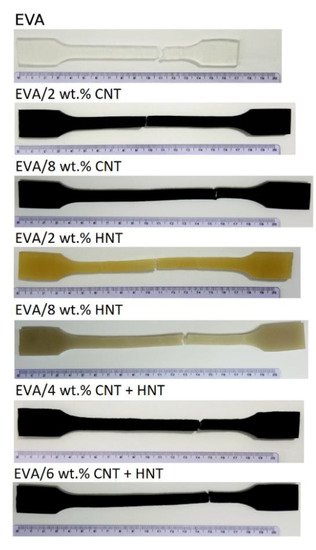 The extent degradation of the EVA matrix upon processing may be ruled out as this would also decrease strains to break of manufactured composites. The addition of HNT’s increases also the flow of EVA, which was reflected indirectly in the results MFR presented in Table 4 (MFR). However, it cannot be assessed whether this was caused by EVA/HNTs interaction, degradation of EVA, or a combination of both factors. The interaction of HNTs and MWCNTs particles with EVA polymer chains has not been observed in the results of DSC measurements (Table 2), where only minute changes in the enthalpies of crystal melting and their characteristic temperatures were recorded. Nevertheless, in the EVA nanocomposites, where significant alternation of the supermolecular structure was proven, also, changes have not been observed in the DSC measurements [26,65]. It is also important to notice that MWCNTs and HNTs limited the recoiling of the polymer chains as the samples were not returning to their initial dimensions as quickly as for the neat EVA (Figure 9).