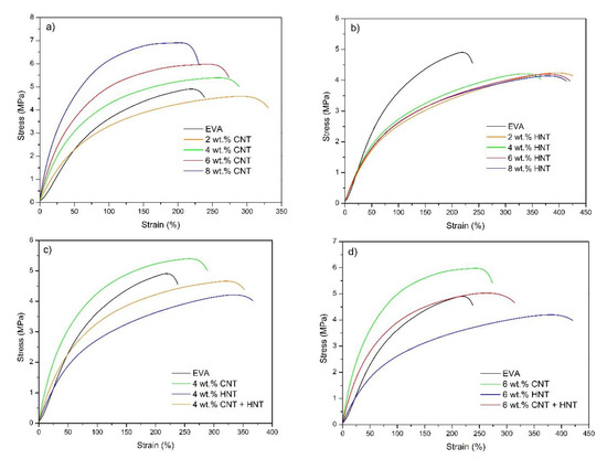 Stress–strain curves of EVA/MWCNT nanocomposites (a), EVA/HNT nanocomposites (b), EVA-based nanocomposites at the total nanofillers content of 4 wt.% (c), and EVA-based nanocomposites at the total nanofillers content of 6 wt.% (d).