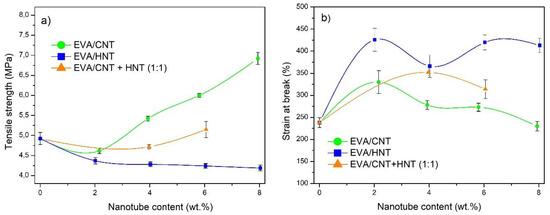 Since MWCNTs are characterized by high Young’s modulus (~1 TPa) and aspect ratio their introduction in the EVA matrix increases the composite stiffness, which can be observed in Figure 10a, as a steepening of stress–strain curves. On the other hand, the filling of EVA with HNT’s reduces the stiffness (Figure 10b). The tensile strength of EVA composites increases with the higher filling ratio of MWCNTs, but in case of filling with HNTs the strength is diminished and the increase of filling ratio has little influence on the tensile performance of the composite (Figure 11a). The addition of MWCNTs reinforces the EVA matrix, while HNT filler gives an adverse effect in terms of composite stiffness and tensile strength. However, the HNTs increase to a great extent the strain to break of EVA. The increase of strain at break and a slight decrease of tensile strength is also noticeable at 2 wt.% of MWCNTs filling ratio, but the effect is explained by high stiffness of MWCNTs, therefore it diminishes with higher filling ratios of MWCNTs. Taking into account that HNTs are considered to be fibrous nanoparticles, however with lower aspect ratio and lower stiffness than their carbon counterpart, they are still much stiffer than the neat EVA copolymer. Therefore, the increase of strain to break and reduction of strength and stiffness by filling with HNTs may be an effect of HNTs affecting the supermolecular structure of EVA. This is also relevant to MWCNTs although this effect is covered up by greater gains in terms of reinforcement at filling ratio > 2 wt.%.