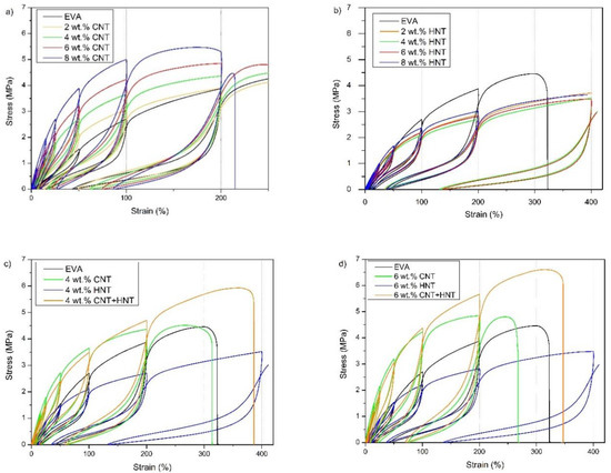 The stress–strain curves under cyclic loading for EVA/MWCNT (a), EVA/HNT (b), EVA/CNT + HNT (c,d) nanocomposites, and the neat EVA copolymer under. Results corresponding to 5%, 15%, 25%, 50%, 100%, and 200% maximum tensile strains.