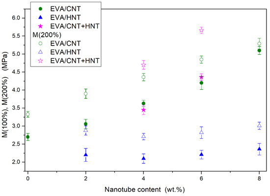 Modulus at 100 and 200% of elongation for the neat EVA and EVA-based nanocomposites after maximum strain attained in the cycle.