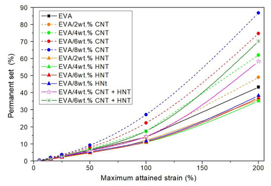 To investigate the elastic deformability and reversibility of the obtained nanocomposites, cyclic tensile tests were carried out. Results are presented in Figure 12, Figure 13 and Figure 14. The contours made by the loops are consistent with the characteristics obtained under the static tensile tests. The hybrid nanocomposites are the exception since tensile strength in the case of cyclic tests is greater than the tensile strength of corresponding nanocomposites with one type of filler (Figure 12). As shown in Figure 13, the value of modulus at 200% strain during cyclic tests, is the highest for hybrid nanocomposite containing 6 wt.% of CNTs and HNTs (over 5.5 MPa). EVA/4 wt.% CNTs + HNTs also achieves higher modulus at 200% strain value than the corresponding nanocomposites with CNTs or HNTs. These differences may result from the orientation of nanotubes along with the tensile direction. After the removal of the applied force, nanotubes did not return to the original position. Thus, the addition of HNTs enables the material to reach higher strains by its plasticizing effect, while CNTs align upon cycling straining and give a higher gain in terms of tensile strength. This reveals an intriguing strengthening mechanism, which occurs because of synergism of both nanotube fillers and which can be used in the development of nanocomposites with behavior allowing to maintain higher cyclic strains and loads. It can be seen that nanocomposites containing CNTs show higher values of the permanent set than the neat EVA copolymer (Figure 14). The EVA/8wt.% CNT nanocomposite showed the highest value of permanent set (PS(200%) of over 85%, which was about two times higher than that of neat EVA copolymer. As mentioned earlier, CNTs increase the stiffness of the composite, which can contribute to higher residual strain values. HNTs behave the opposite way. As can be seen in Figure 12b, EVA/HNTs nanocomposites have slightly better recovery properties, than the neat EVA copolymer.
