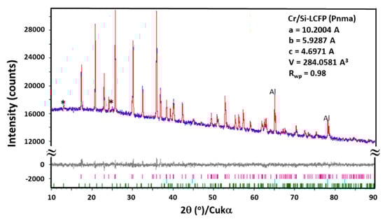 Measured and refined XRD patterns of the as-made Cr/Si-LCFP electrode. Blue = observed; red = calculated; grey = difference; magenta = LCFP; turquoise = Al; green/* = Li9Cr3(PO4)2(P2O7)3.