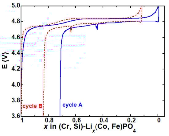 - Allen, J.L.; Allen, J.L.; Thompson, T.; Delp, S.A.; Wolfenstine, J.; Jow, T.R. Cr and Si Substituted-LiCo0.9Fe0.1PO4: Structure, full and half Li-ion cell performance. J. Power Sources 2016, 327, 229–234. [Google Scholar] [CrossRef]