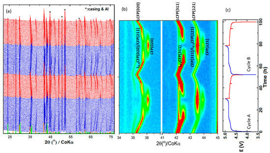Cr/Si co-doped LiCo0.82Fe0.1PO4 was prepared via a high-energy ball milling of the raw materials, followed by a solid-state reaction. A slurry with 85 wt.% of LCFP active material was tape casted on a 15 µm thick Al foil. Detailed information about the preparation of the powder and cathode can be found in one of our previous works []. The in situ XRD patterns were collected from a standard 2032-coin cell with an 8 mm hole drilled on the top case. The Al current collector from the cathode film also acted as an X-ray window, and a silver paste was used to seal the Al window and the top part of the stainless-steel cell case. Figure 1 is a schematic diagram of the in situ cell. The in situ X-ray measurements were performed with a Smartlab diffractometer (Rigaku, Tokyo, Japan) using Co-Kα radiation at a step size of 0.04° and scan rate of 2.219°/min—i.e., 30 min/scan. The sample displacements were corrected by taking the Al diffraction peak as reference.