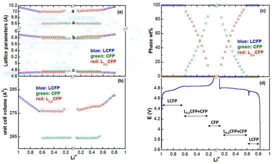 Variation of lattice parameters in cycle B: (a) lattice parameters; (b) unit cell volumes; (c) phase wt.% and (d) cell potential vs. the Li content during the charge/discharge process.