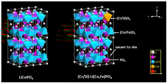 Schematic crystal structure diagrams of LiCoPO4 and (Cr/Si)-Li(Co,Fe)PO4.