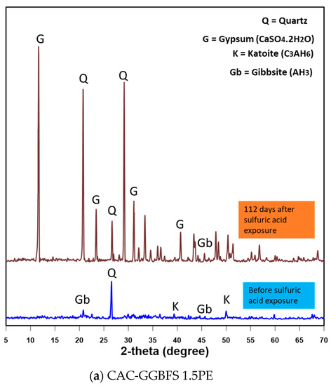 - The main deterioration mechanism in the sulfuric acid testing indicated from XRD analysis was found to be the formation of gypsum on the exterior surfaces of the specimen for the sample without fibre reinforcement, followed by surface delamination and spalling. The main crystalline products in the samples after sulfuric acid attack are gypsum in both CAC-based and OPC-based mixtures. The reappearance of gibbsite in CAC-based samples can neutralise more acid and result in a better performance than the OPC-based system.