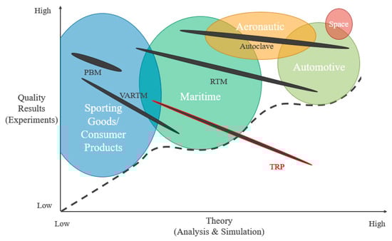 The need for autoclave alternatives for high-performance composite processing that allow faster throughput while maintaining performance becomes more pronounced as the demand for fiber-reinforced polymers (FRPs) increases. The current state of continuous fiber composite manufacturing for high-performance polymer matrix composites (PMCs) is dominated by manufacturing techniques that are straight forward to experimentally improve via an intensive trial and error process. In order to move beyond the regime of trial and error manufacturing processes (Figure 1), robust simulation methods must be established to model processing. In Figure 1, the theory is compared with the quality of experimental results for different processing methods, including the Trapped Rubber Processing (TRP) method studied in this paper. The term “Theory” on the x-axis represents the amount of effort expended to understand the structural analysis, material science and manufacturing engineering of PMCs. “Quality of results” indicated on the y-axis represents the complex experimental methods and structural design trees or number of full-scale tests needed to verify the robustness of a PMC component or structure design. High-performance PMCs (PMCs with fiber volume fractions greater than 50%) are generally used in five primary industries: sporting goods or consumer products, maritime structures, aeronautic structures, automotive components, and space structures [1,2,3]. In general, the easier it is to fabricate and test a design, the lower the need for advanced simulation. As the difficulty, size and cost of testing apparatus increases, more robust simulation procedures are required for the processing design. Each industry has developed a unique approach to structural design and processing design. A common aeronautic ‘building block’ approach to experimental testing and certification includes multiple levels of testing [3]. These range from the small-scale coupon testing to the large-scale component level [3]. The automotive industry includes full vehicle simulations in medium-to-large volume production runs, which leads to a greater emphasis on the computational characterization of the structural material response and the processing design characterization [1].