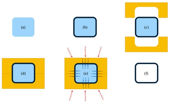 Schematic of trapped rubber processing (TRP) in a simplified cross-section view: (a) initial rubber section, (b) preform construction, (c) clamshell cavity mold, (d) processing mold assembly, (e) heating and pressure cycle, (f) demolding.