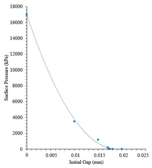 In order to initialize the gap between the aluminum mold and the rubber, gap correlation simulations were conducted. The approximate average gap was found to be 0.017 mm for the corresponding experimental tests. Because of the construction method, it was assumed that there was no gap between the stainless steel and rubber surfaces. The results for the gap correlation can be seen in Figure 6. The gap shown here is the distance from a point on the outer surface of the rubber sphere to the closest point on the inner surface of the aluminum mold if the rubber was exactly concentric with the mold cavity when being suspended. This is an idealized case, and gravity is omitted for simplicity. As the gap between the surfaces decreases, the maximum surface pressure at thermal equilibrium increases sharply. Thus, the maximum surface pressure is highly sensitive to the dimensions of the mold assembly components. This highly nonlinear effect is one of the reasons why it is difficult to optimize TRP using a trial and error approach.