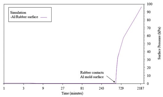 The elements used for the stainless steel and aluminum sections in the molding assembly are C3D8RT (eight-node thermally–mechanically coupled hexahedral elements with reduced integration) [34]. The use of reduced integration elements reduces the total simulation runtime by approximately 30% and has a negligible effect on the results. The use of reduced integration elements resulted in a surface pressure that was less than 1% lower than the surface pressure obtained using fully integrated elements. The rubber material is modeled using Abaqus/Standard [34] C3D8HT (8-node thermally–mechanically coupled hexahedral, trilinear displacement and temperature, hourglass control, hybrid, constant pressure) elements, and the analysis is run in single precision. By using hybrid elements for the rubber, the runtime is decreased by over 30%, while resulting in an interface surface pressure that is approximately 1% lower than the simulation using the fully integrated elements with the hybrid formulation being marginally closer to the experimental results. There were no convergence issues with any of the formulations included in the study.
