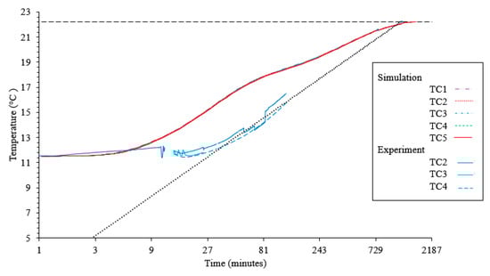 The thermal conductivity was derived from the TRP characterization test results. Equation (3) is derived from the steady state heat flow experiment by [39]. Here, is the thermal conductivity. is the temperature in the rubber at 2 mm outside of the interior stainless steel rubber interface taken after 60 min, is the temperature in the rubber at 4 mm outside of the interior stainless steel rubber interface taken after 60 min, and is the temperature in the rubber at 4 mm outside of the interior stainless steel rubber interface taken after 30 min. The time span of 30–60 min is used to derive the thermal conductivity because, in this range, the heat conduction is highest, which leads to a more precise determination. The computed thermal conductance fits well with the expected result [29].
