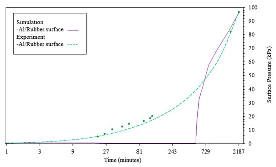 The heat transfer at the interface is complex and depends on many physical properties [40]. Thermal interfacial contact conductance properties [41] are required to simulate contact between the different internal material surfaces in the processing mold simulation. Tabular thermal conductance is used, with only pressure-dependent data. The variation of thermal contact conductance with the amount of pressure at the contact surface is directly included in the contact property. Two contact surfaces are defined for the contact between the aluminum and the rubber and the contact between the stainless steel and the rubber. Table 2 provides the detailed gap conductance and contact conductance used for the two surface pairs. The first contact pair consists of the inner surface of the aluminum mold and the outer surface of the rubber and the second contact pair comprises the contact between the inner surface of the rubber and the outer surface of the stainless steel sphere. A surface-to-surface contact interaction is defined, and no interference is allowed for each contact pair. Additionally, convection has been accounted for assuming the gaps are filled with natural atmospheric gases. Here, the flow of heat is approximated as if between two large planar surfaces, because the radius of curvature of the mold is very large when compared with the spacing between contacts [41]. The surface roughness of the aluminum mold at the rubber interface was 0.8 μm and the surface roughness of the stainless steel sphere was approximately 0.01 μm. Because of the relatively low surface roughness of the stainless steel sphere, there is a possibility that the selected literature values give an underestimate of the interface conductance. However, in this study, the interface conductance was not directly measured. Based on literature, values in the range between 0.1 and 1 MPa [42] and a logarithmic relationship between contact conductance and pressure are applied for the simulation [43,44].