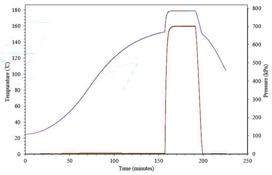 The model and its parameters described above were then used to simulate part processing in advanced trapped rubber molding. A similar TRP assembly can be used to process thermoplastic composite tape or thermoset pre-impregnated fibers (prepreg). An example is simulated for use with a prepreg that has an optimal cure temp of 180 °C cure pressure of 700 kPa (7 bar) and a ramp rate of 2 °C min. Here, the gap has been determined via simulation optimization to be 0.19 mm for the previously described experimental assembly. Based on this, the cure cycle can be simulated as seen in Figure 10. The full analysis took 422 s on a local computer with an IntelTM i7-7600U CPU running at 2.80 GHz. The simulation boundary conditions have prescribed heat-up, dwell and cool-down steps. The resulting predicted temperature of the rubber can be seen in Figure 10 as the violet curve and the resulting predicted surface pressure is seen as the red curve. The resulting processing cycle fits with many common autoclave resins [5]. It can also be seen that a post cure without pressure would be possible at 170 or 175 °C. This example does not simulate the composite prepreg material. However, it is expected that current simulation techniques for composite processing [10] can be combined with the TRP simulation to yield a good approximation of the in-situ resin temperature and pressure during the cycling.