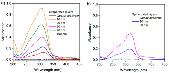 The thickness of the layers can be controlled with reasonable precision, relying on one hand on the deposition time (for the evaporation process), and on the other hand on the spinning rate and the concentration of the solution (for the spin-coating process). Figure 2 represents the absorption of the different heptazine deposited layers, in function of the thickness (measured through a profilometer, see Materials and Methods (Section 3)).