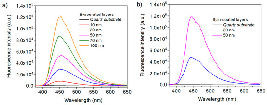Fluorescence of heptazine layers deposited on quartz, in function of the measured thickness. (a) Evaporated layers and (b) spin-coated layers.