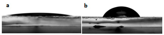 Contact angle on an ITO plate without (a) and with (b) a deposited heptazine layer.
