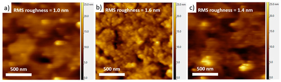 The morphology of the films has also been characterized by optical microscopy (OM) and at the nanoscale by atomic force microscopy (AFM). AFM images of both evaporated and spin-coated heptazine films on ITO are given in Figure 5 (the OM images are given as Supplementary Materials, Figure S2).