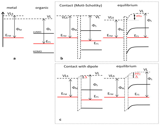 (a) Kelvin Probe Force Microscopy (KPFM) measurements of a metal and an organic layer Vacuum Levels (VL’s) for metal are higher than standard VL because of electron environment at surface); (b) contact (left) and electronic equilibrium (right) between the electrode and the organic layer according to the Mott–Schottky law; (c) contact (left) and electronic equilibrium (right) between the electrode and the organic layer in the case of interfacial dipole.