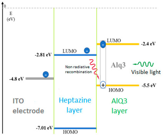 Scheme of the electron transfer from an activated Alq3 layer into an underlying sandwiched accepting heptazine 1 layer, deposited on an ITO electrode.