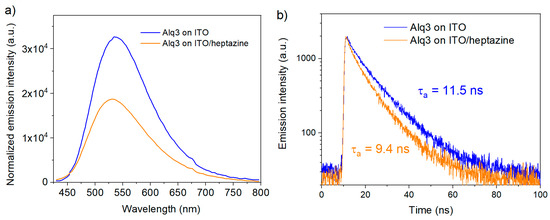 Photoluminescence emission (a) and TRPL (time-resolved photoluminescence) decay curves (b) of 10 nm thick Alq3 layer deposited on ITO and on an ITO/heptazine (50 nm) substrate.