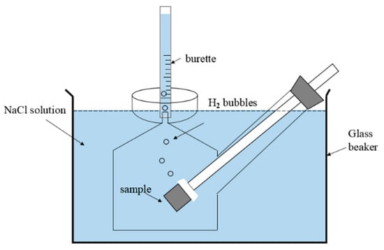 Following the work of Shi [46], plug-in specimens were employed to perform the hydrogen evolution test in 0.1 M NaCl at room temperature (~25 °C). Figure 1 presents the schematics of the test system. The cast ZK60 specimens (10 × 10 × 10 mm3) were treated as the above weight loss samples. The evolved hydrogen was collected into a burette, and its volume (VH, mL cm−2) was recorded at different times. The hydrogen evolution rate, vH (mL·cm−2 day−1), can also be converted to a general corrosion rate, PH (mm y−1), using [5,44].