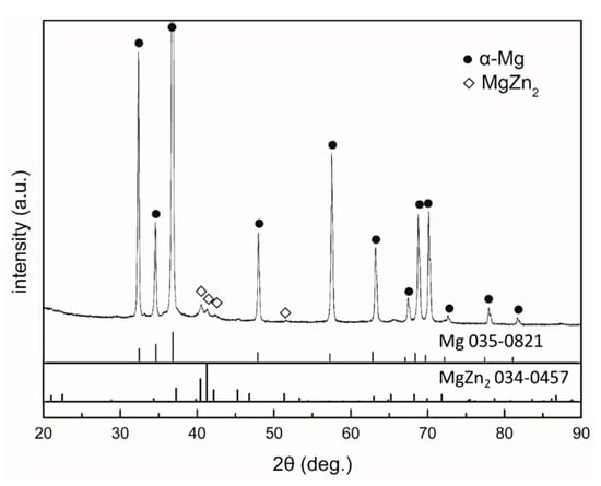 Figure 2 shows the optical and the back-scattered electron (BSE) SEM micrographs of the cast ZK60 alloy. The microstructure of the cast ZK60 alloy was composed of an α-Mg phase and large second-phase particles, which were mainly deposited along the grain boundaries (Figure 2a,b). According to [47,48], the main components of these particles are Mg and Zn and may be MgZn2 and MgZn. The XRD pattern of the cast ZK60 alloy in Figure 3 only displays the presence of MgZn2. No discernable diffraction peaks from MgZn were detected in this work, which suggests no MgZn phase in the studied alloy; also, there is no Zr detected, maybe due to its low content in the test sample. However, the XRD patterns cannot give accurate structural information for the second phase. Therefore, the crystal structures of the abovementioned second phases were characterized using TEM in detail as follows.