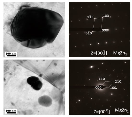 To further verify the second phase in the as-cast ZK60 alloy, Figure 4 presents the TEM micrograph of the as-cast ZK60 alloy. Block-shaped and globular second-phase particles can be observed in Figure 4. The blocky phase has a size of about 500 nm, and the globular phase is about 100 nm. Figure 4 also presents the corresponding selected area electron diffraction (SAED) patterns of the second phase. The SAED patterns proved that the two second-phase particles were MgZn2 [49]. No MgZn phase was found in the as-cast ZK60 alloy.