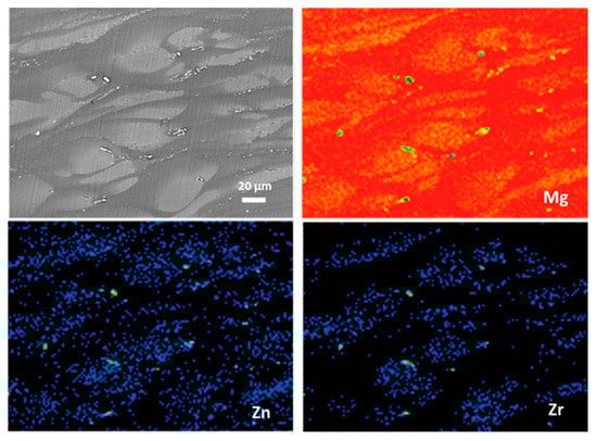BSE-SEM image of the cast ZK60 alloy and the corresponding area distributions of Mg, Zn, and Zr.
