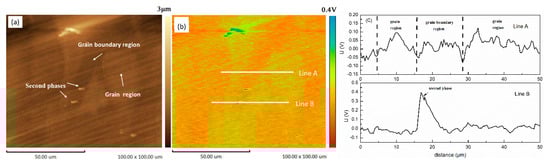 (a) Scanning Kelvin probe force microscopy (SKPFM) topography map; (b) Potential map of the same area; (c) Volta potential profiles along lines A and B in the SKPFM image.
