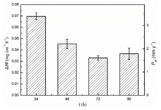 Figure 7 shows the ΔW (mg cm−2 h−1) and Pw (mm y−1) values of the cast ZK60 alloy immersed in 0.1 M NaCl for different times (t). The Pw at 24 h was the largest (3.5 ± 0.1 mm y−1), which is similar to that of a cast ZK60 in 0.9% NaCl (4.6 ± 0.6 mm y−1) reported by Merson et al. [52]. Then, it gradually decreased by approximately half to a relatively stable value (1.4~1.7 mm y−1) over 72–96 h. The decrease in Pw over 72–96 h may have been related to the increase in the corrosion product layer Mg(OH)2 on its surface [53].
