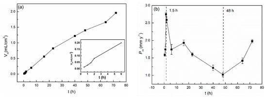 Changes in (a) VH and (b) PH of the cast ZK60 alloy as a function of time measured by the hydrogen evolution test in 0.1M NaCl.