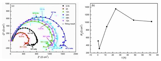 (a) Nyquist plots measured at Ecorr for the cast ZK60 alloy immersed in 0.1 M NaCl for different times; (b) Rp–t curves at 25 °C.