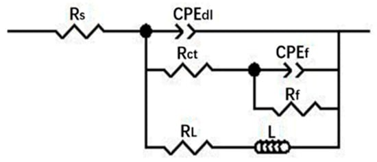Figure 10 presents the EIS of the cast ZK60 alloy immersed in 0.1 M NaCl for different times and the change in Rp (polarization resistance) as a function of time. All the Nyquist plots display two capacitive loops in the high-frequency region and an inductive loop in the low-frequency region, which is similar to the EIS features of other Mg alloys [59]. The capacitive loops are related to the processes in the surface film and the electrical double layer [60], and the inductive loop should be attributed to the initiation of the localized corrosion on the surface of the cast ZK60 alloy according to [61,62,63]. Based on these EIS features, Figure 11 presents an equivalent circuit to fit the EIS results in Figure 10a [58,59,64,65]. Rs is the solution resistance. CPEf and CPEdl represent the constant phase elements (CPE) for the surface film and the electrical double layer, respectively. Rf and Rct represent the surface film resistance and charge-transfer resistance, respectively. RL and L represent equivalent resistance and inductance to describe the low-frequency inductance. It should be noted that Rct is the parallel of the charge-transfer resistance of the anodic process and the cathodic process (Rct,a and Rct,c) at Ecorr [63]. The fitting curves are also displayed in Figure 10a, and the fitting parameters are listed in Table 2.