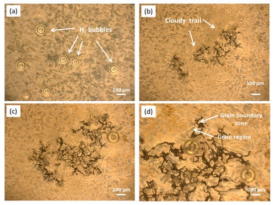 Optical in situ corrosion images of the cast ZK60 etched sample immersed in 0.1 M NaCl for different times: (a) 20 min; (b) 40 min; (c,d) 60 min.