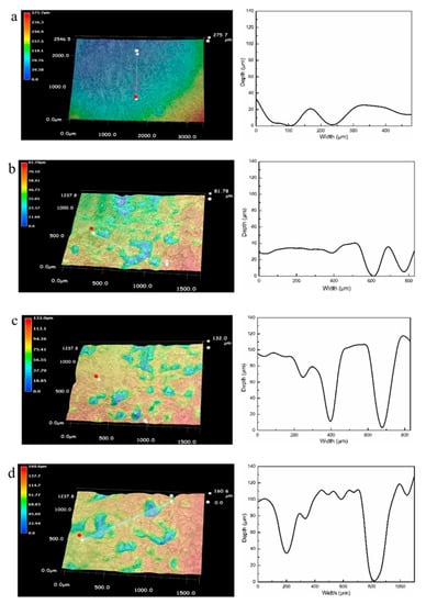 3D corrosion images and depth profiles of the cast ZK60 alloy immersed in 0.1 M NaCl for different times: (a) 12 h; (b) 24 h; (c) 48 h; (d) 72 h (without corrosion products).