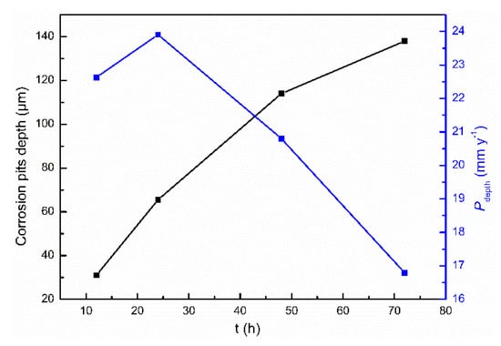 To characterize the development of corrosion pits, the deepest pit on the cast ZK60 sample was selected after immersion in 0.1 M NaCl for different times, and their 3D morphologies and depth profiles were measured, as shown in Figure 16. The density and depth of the corrosion pits increased over 12–72 h, and the size of the pit mouth was generally larger than the pit depth, which is similar to the corrosion morphologies in Figure 15. The corresponding pit depth at different corrosion times was employed to calculate the average penetration rate (Pdepth, mm y−1), which is also presented in Figure 17. The pit depth increased with time, but the fastest Pdepth occurred in the period of 12–24 h (~24 mm y−1) before gradually decreasing to ~16.6 mm y−1 in the period of 24–72 h.
