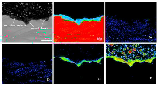 Electron probe micro-analyzer (EPMA) maps of the elemental distribution in the cross-section of a corrosion pit on the cast ZK60 alloy immersed in 0.1 M NaCl for 72 h.