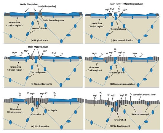 Compared to the Mg matrix in the grain boundary regions, those with stable oxide film act as micro-galvanic cathodes. Under the attack of Cl−, the film around the second phase could be easily broken due to the higher numbers of imperfections [78]. Therefore, the micro-galvanic corrosion was initiated in the areas around the large discontinuous second-phase particles in the grain boundaries, owing to the strong galvanic effect between these second-phase particles and the Mg matrix in the grain boundaries (Figure 13b). It should be noted that there were some second-phase particles deposited in the grains (Figure 2a and Figure 6), and therefore, the corrosion may also be initiated in the grains. However, we did not observe this phenomenon, which may be due to the stable oxide film in the grains (Zr-rich region) and the light galvanic effect between them.