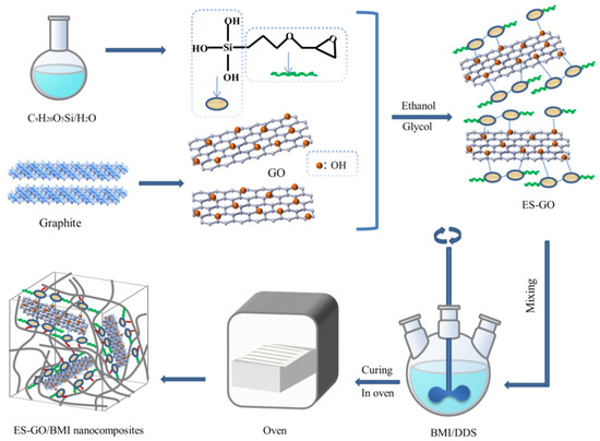 Schematic diagram for the preparation of epoxy silane modified graphene oxide (ES-GO)/Bismaleimide (BMI) nanocomposites.