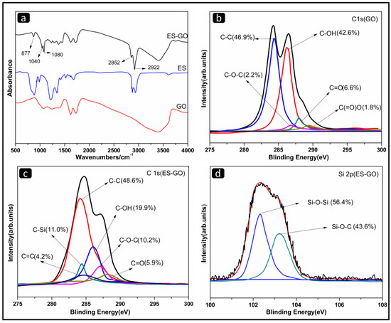 Figure 2b–d display the XPS information of GO and ES-GO nanocomposites respectively. They are applied to further analyze the bond state of the surface and the elementary composition. As can be seen from Figure 2b, the C1s peaks of GO are deconvoluted into five forms of carbon, including C–C (284.5 eV), C–OH (286.2 eV), C–O (287.5 eV), C=O (288.7 eV) and C(=O)O (289.4 eV). The XPS spectrum of ES-GO (Figure 2c) exhibits a new peak located in 284.4 eV, which is related to C–Si. In addition, the C–OH content of ES-GO showed a significant decrease compared with GO, which can be attributed to epoxy silane reaction with the hydroxyl groups on the surface of graphene oxide after hydrolysis (as shown in Figure 1) resulting in a decrease in C–OH content. As can be judged from Figure 2d, the Si2p peaks of ES-GO in XPS spectrum are deconvoluted into two forms, including Si–O–Si (102.3 eV) and Si–O–Si (103.5 eV), which indicates that ES molecules were grafted onto the GO surface. This is consistent with the results of FTIR analysis.