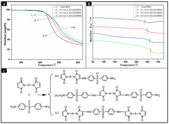 (a) Thermogravimetric analysis (TGA) curves of cured resin systems with different amount of ES-GO; (b) Differential scanning calorimeter (DSC) curves of cured resin systems with various amounts of ES-GO; (c) Proposed reactions in the process of 4,4-Diaminodiphenyl sulfone (DDS) chain extension of BMI.