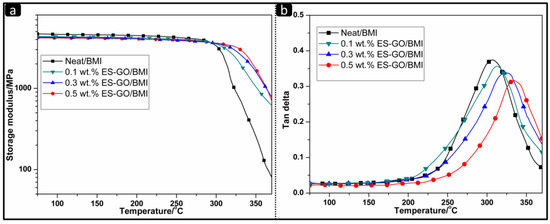It can be seen from Figure 4a that the storage modulus (E′) changes with the change of mechanical properties. When the transition is about to end, the storage modulus decreases to almost zero. No significant differences were observed in the storage modulus change curves of all systems at temperatures below 300 °C. The storage modulus of the modified system containing ES-GO is slightly lower than that of the unmodified system; when the temperature continues to rise, the maximum decrease rate of storage modulus for different content systems is inversely related to the content of ES-GO. It can be proved that the ES-GO containing resin system has a higher cross-linking density than the neat resin system by DMA analysis. The increase in crosslink density can further reduce the mobility of molecular chains and make the network structure stable. Due to ES-GO participating in the curing reaction and forming a cross-linked network structure with the BMI resin matrix, a difference between the elastic modulus and tensile strength of modified resin systems with different ES-GO contents was observed.