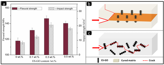 (a) Mechanical properties of the cured resins with different content of ES-GO; (b) mechanism of crack pining; (c) mechanism of crack deflection.