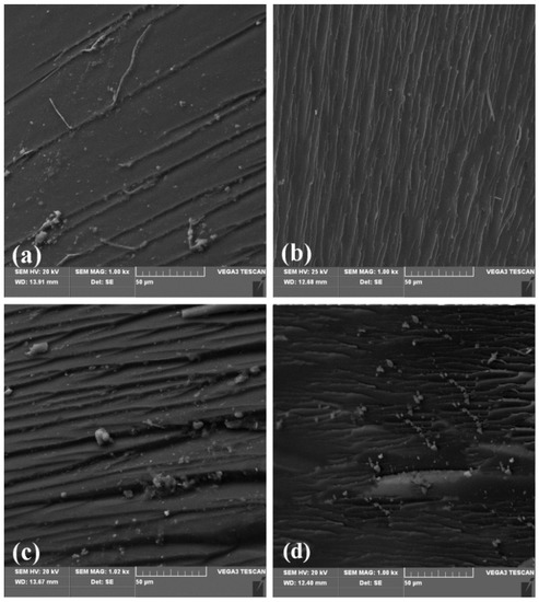 Effect of ES-GO content on the morphology of fractured surface of BMI with ES-GO contents: (a) 0, (b) 0.1 wt.%, (c) 0.3 wt.%, (d) 0.5 wt.%.