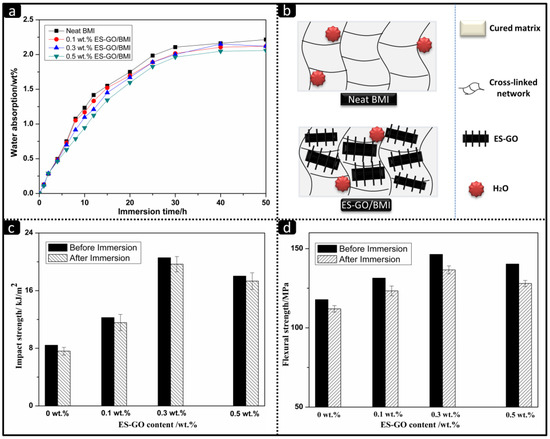 It can be seen that the water absorption rates of all systems follow a typical kinetic curve time vs. concentration, with water uptake increase depending on the time. The initial stage of water absorption belongs to the diffusion control stage. Water molecules could quickly diffuse to the free space on the surface of the cured product in this stage, and the water absorption rate was determined by the concentration difference between the inside and outside of the cured product. Therefore, the water absorption rates of all systems are similar. With the increase in time of immersion, it can be seen that the ES-GO content is inversely proportional to the water absorption rate of the system. The higher the ES-GO content is, the lower the water absorption rates become, which can be attributed to the movement of the water molecule being restricted by the higher density of cross-linked network in the matrix. The schematic illustration of the mechanism of water resistance is shown in Figure 7b. Therefore, the higher the density of the cross-linked network is, the greater the restriction of the water molecule is, and the lower the water absorption rate becomes. As analyzed, when the content of ES-GO increases, the cross-link density of the modified resin system would increase and the free volume would become smaller, which results in an improvement of moisture absorption. It can be seen from Figure 7a that the saturated water absorption of the 0.5 wt.% ES-GO content system stay approximately at 2.1%.