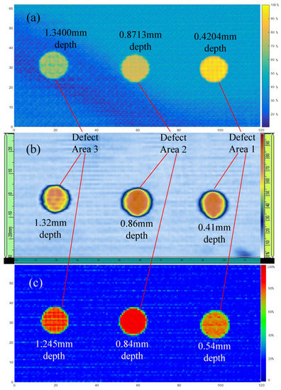 | Sample | Defect Area 1 (0.41 mm Depth) | Defect Area 2 (0.86 mm Depth) | Defect Area 3 (1.32 mm Depth) | |||