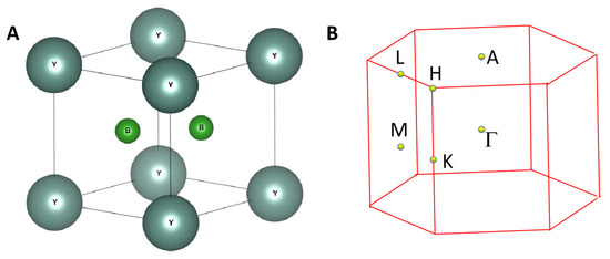 Hexagonal-type YB2 with a P6/mmm space group was the focus of this study. According to the Materials Project Database [45], the formation energy per atom for YB2 is −0.564 eV and the Inorganic Crystal Structure Database IDs of 615708 and 44602 are assigned to YB2. The crystal structure of YB2 is shown in Figure 1A. One primitive cell contains one Y atom and two B atoms. The Y atom occupies the (0,0,0) sites and the two B atoms occupy the (0.3333, 0.6666, 0.5) and (0.6666, 0.3333, 0.5) sites.